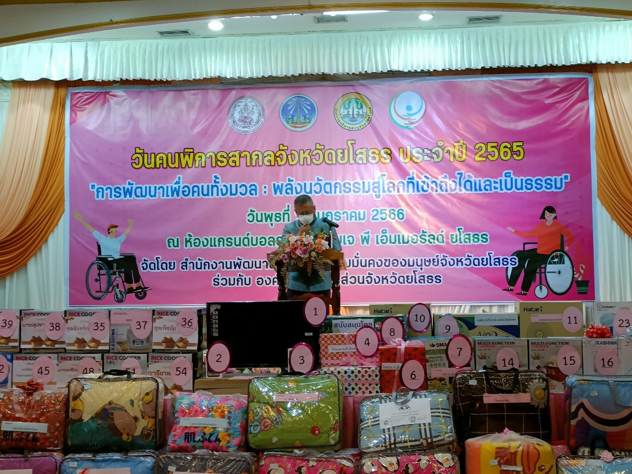 วันที่ 15 ม.ค. 2566 (14:58 น.)วันที่ 11 มกราคม 2566 เวลา 11.00 น. นายวิรุจ วิชัยบุญ ผู้ว่าราชการจังหวัดยโสธร เปิดงานวันคนพิการสากล ประจำปีงบประมาณ 2565 ซึ่งจัดโดยสำนักงานพัฒนาสังคมและความมั่นคงของมนุษย์จังหวัดยโสธร ร่วมกับองค์การบริหารส่วนจังหวัดยโสธร โดยมี นายบันลือ สัมฤทธิ์จินตนา ปลัดจังหวัดยโสธร หัวหน้าส่วนราชการ คนพิการพร้อมครอบครัว หน่วยงานภาครัฐ ภาคเอกชน องค์กรเครือข่ายผู้ปฏิบัติงานด้านคนพิการ เข้าร่วมกว่า 500 คน ที่ ห้องแกรนด์ บอลรูม โรงแรม เจ.พี.เอมเมอรัลด์ ยโสธร โดยกิจกรรมภายในงาน ประกอบด้วยการประกวด Miss & Mr. Disability 2022 ซึ่งเป็นการโชว์การแสดงและความสามารถของผู้เข้าประกวด พร้อมมอบสายสะพายให้กับผู้ที่ได้รับรางวัลชนะเลิศอันดับ 1-3 และมอบเงินรางวัลให้กับผู้เข้าประกวดทุกคน มีการมอบประกาศเกียรติคุณให้แก่ คนพิการที่กู้ยืมเงินประกอบอาชีพเพื่อเป็นแบบอย่างที่ดีสำหรับคนพิการคนอื่น ๆ ที่ต้องการประกอบอาชีพ