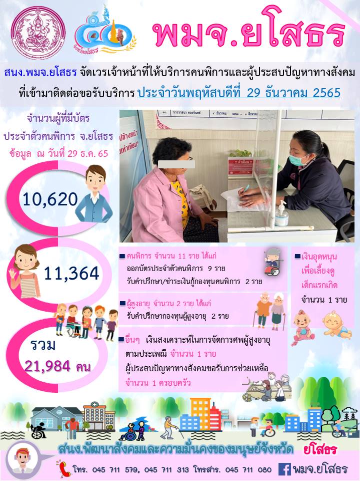 สนง.พมจ.ยโสธร จัดเวรเจ้าหน้าที่ให้บริการคนพิการและผู้ประสบปัญหาทางสังคม ที่เข้ามาติดต่อขอรับบริการ (29 ธันวาคม 2565)