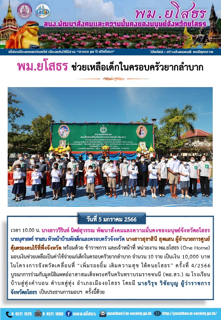 วันที่ 16 ม.ค. 2566 (11:44 น.)วันที่ 5 มกราคม 2566 เวลา 10.00 น. นางสาววีรินท์ นิตย์สุวรรณ พัฒนาสังคมและความมั่นคงของมนุษย์จังหวัดยโสธร นายนุศาสตร์ ชาเสน หัวหน้าบ้านพักเด็กและครอบครัวจังหวัด นางสาวสุธาสินี สุดแสน ผู้อำนวยการศูนย์คุ้มครองคนไร้ที่พึ่งจังหวัด พร้อมด้วย ข้าราชการ และเจ้าหน้าที่ หน่วยงาน พม.ยโสธร (One Home) มอบเงินช่วยเหลือเป็นค่าใช้จ่ายแก่เด็กในครอบครัวยากลำบาก จำนวน 10 ราย เป็นเงิน 10,000 บาท ในโครงการจังหวัดเคลื่อนที่ “เพิ่มรอยยิ้ม เติมความสุข ให้คนยโสธร” ครั้งที่ 4/2566 บูรณาการร่วมกับมูลนิธิแพทย์อาสาสมเด็จพระศรีนครินทราบรมราชชนนี (พอ.สว.) ณ โรงเรียนบ้านดู่ทุ่งคำบอน ตำบลดู่ทุ่ง อำเภอเมืองยโสธร โดยมี นายวิรุจ วิชัยบุญ ผู้ว่าราชการจังหวัดยโสธร เป็นประธานการมอบฯ ครั้งนี้ด้วย