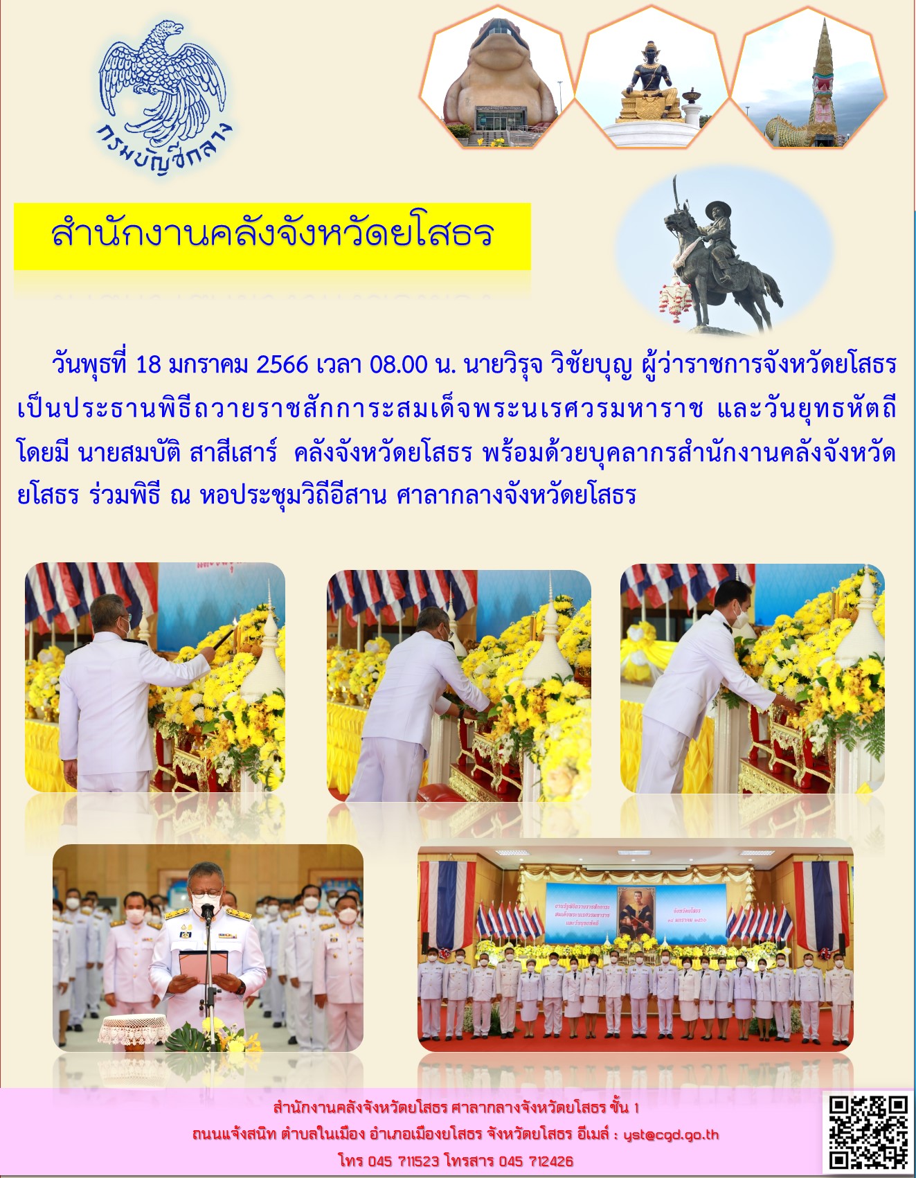 วันพุธที่ 18 มกราคม 2566 เวลา 08.00 น. นายวิรุจ วิชัยบุญ ผู้ว่าราชการจังหวัดยโสธร เป็นประธานพิธีถวายราชสักการะสมเด็จพระนเรศวรมหาราช และวันยุทธหัตถี โดยมี นายสมบัติ สาสีเสาร์ คลังจังหวัดยโสธร พร้อมด้วยบุคลากรสำนักงานคลังจังหวัดยโสธร ร่วมพิธี ณ หอประช