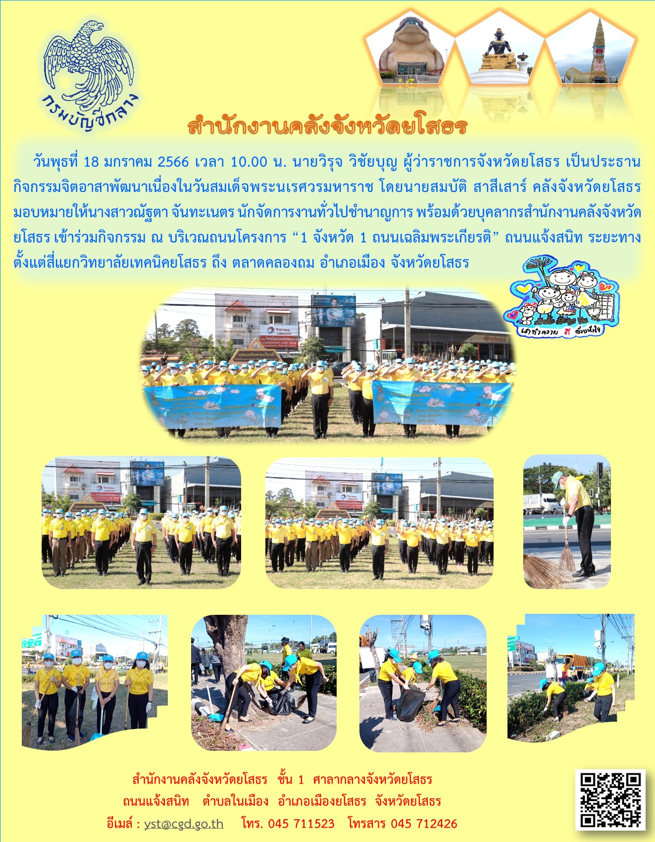 วันที่ 18 ม.ค. 2566 (14:10 น.)วันพุธที่ 18 มกราคม 2566 เวลา 10.00 น. นายวิรุจ วิชัยบุญ ผู้ว่าราชการจังหวัดยโสธร เป็นประธานกิจกรรมจิตอาสาพัฒนาเนื่องในวันสมเด็จพระนเรศวรมหาราช โดยนายสมบัติ สาสีเสาร์ คลังจังหวัดยโสธร มอบหมายให้นางสาวณัฐตา จันทะเนตร นักจัดการงานทั่วไปชำนาญการ พร้อมด้วยบุคลากรสำนักงานคลังจังหวัดยโสธร เข้าร่วมกิจกรรม ณ บริเวณถนนโครงการ “1 จังหวัด 1 ถนนเฉลิมพระเกียรติ” ถนนแจ้งสนิท ระยะทางตั้งแต่สี่แยกวิทยาลัยเทคนิคยโสธร ถึง ตลาดคลองถม อำเภอเมือง จังหวัดยโสธร