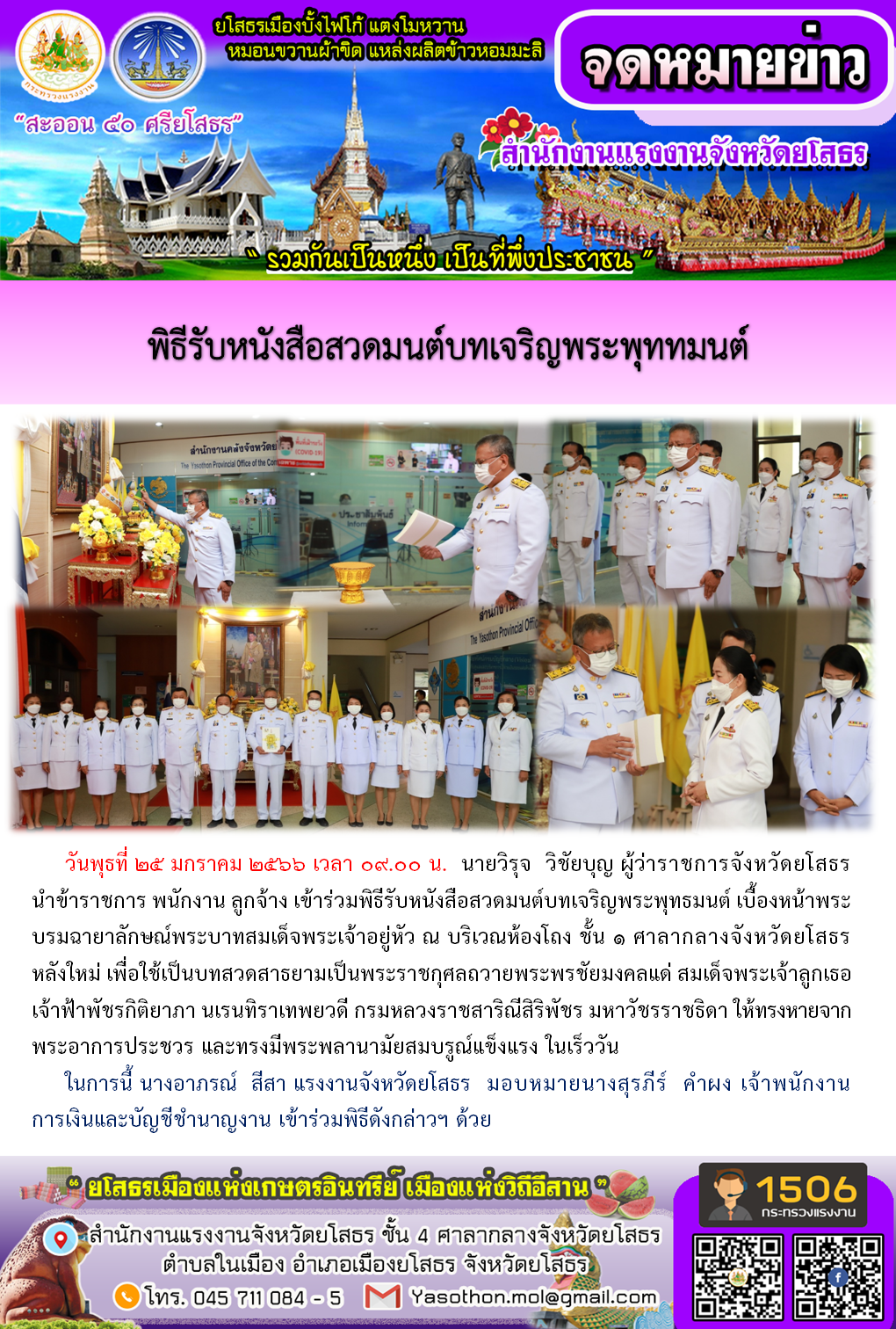 สำนักงานแรงงานจังหวัดยโสธร เข้าร่วมพิธีรับหนังสือสวดมนต์บทเจริญพระพุททมนต์