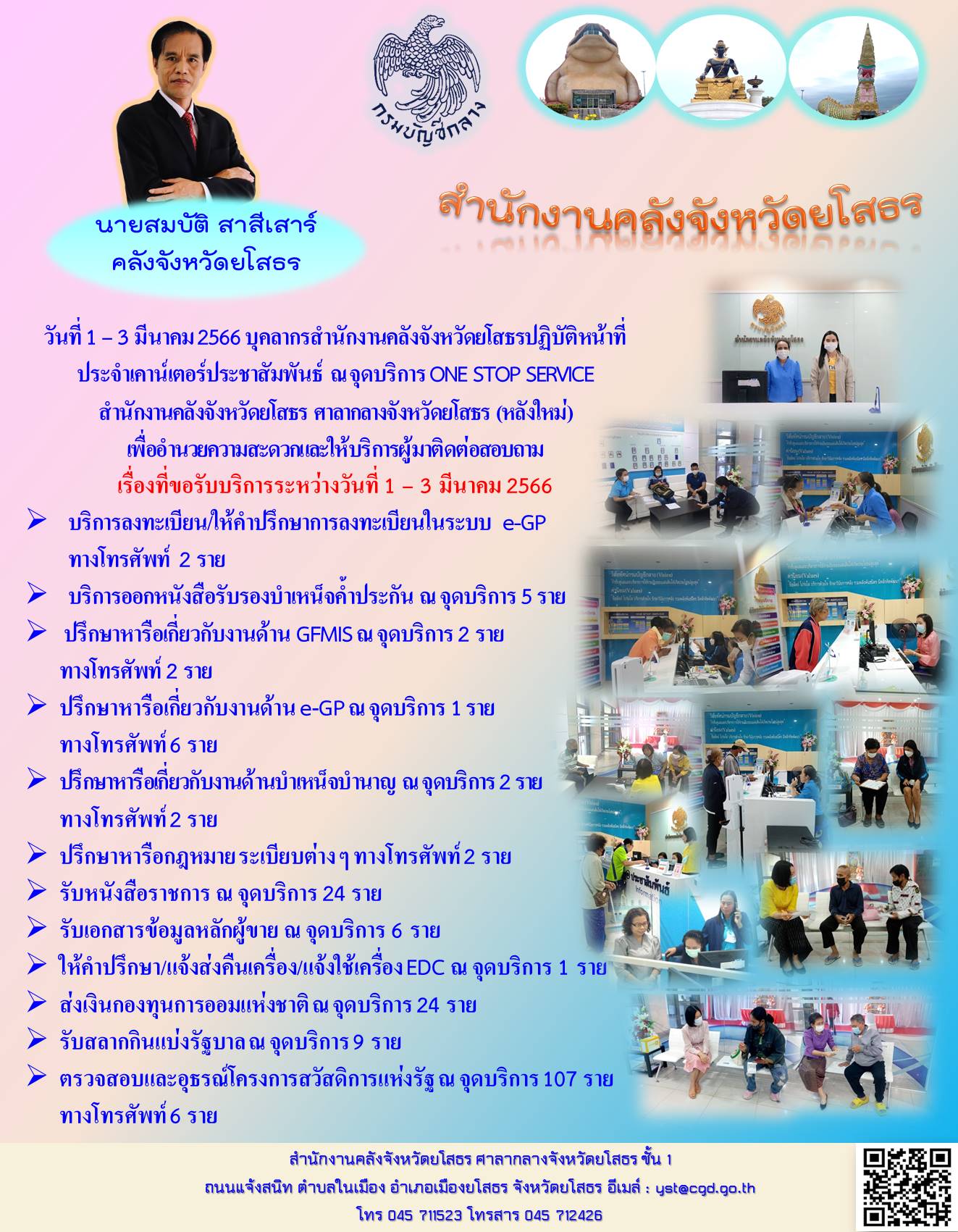 วันที่ 1 – 3 มีนาคม 2566 บุคลากรสำนักงานคลังจังหวัดยโสธรปฏิบัติหน้าที่ ประจำเคาน์เตอร์ประชาสัมพันธ์ ณ จุดบริการ ONE STOP SERVICE สำนักงานคลังจังหวัดยโสธร ศาลากลางจังหวัดยโสธร (หลังใหม่) เพื่ออำนวยความสะดวกและให้บริการผู้มาติดต่อสอบถาม