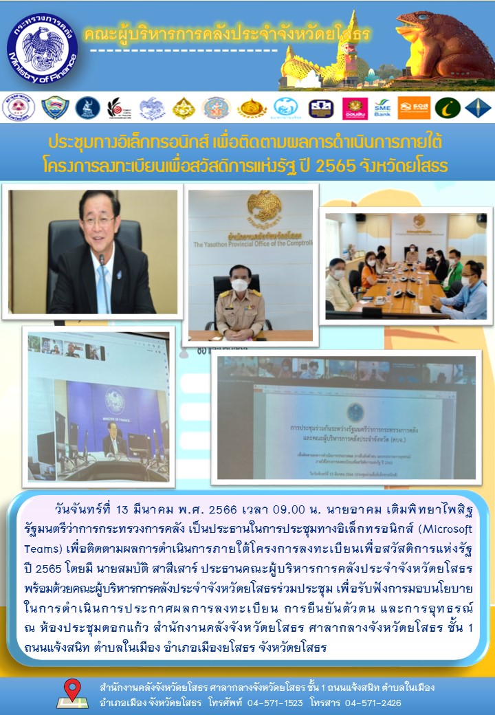 วันที่ 14 มี.ค. 2566 (16:15 น.)วันจันทร์ที่ 13 มีนาคม พ.ศ. 2566 เวลา 09.00 น. นายอาคม เติมพิทยาไพสิฐ รัฐมนตรีว่าการกระทรวงการคลัง เป็นประธานในการประชุมทางอิเล็กทรอนิกส์ (Microsoft Teams) เพื่อติดตามผลการดำเนินการภายใต้โครงการลงทะเบียนเพื่อสวัสดิการแห่งรัฐ ปี 2565 โดยมี นายสมบัติ สาสีเสาร์ ประธานคณะผู้บริหารการคลังประจำจังหวัดยโสธร พร้อมด้วยคณะผู้บริหารการคลังประจำจังหวัดยโสธรร่วมประชุม เพื่อรับฟังการมอบนโยบาย ในการดำเนินการประกาศผลการลงทะเบียน การยืนยันตัวตน และการอุทธรณ์ ณ ห้องประชุมดอกแก้ว สำนักงานคลังจังหวัดยโสธร ศาลากลางจังหวัดยโสธร ชั้น 1 ถนนแจ้งสนิท ตำบลในเมือง อำเภอเมืองยโสธร จังหวัดยโสธร