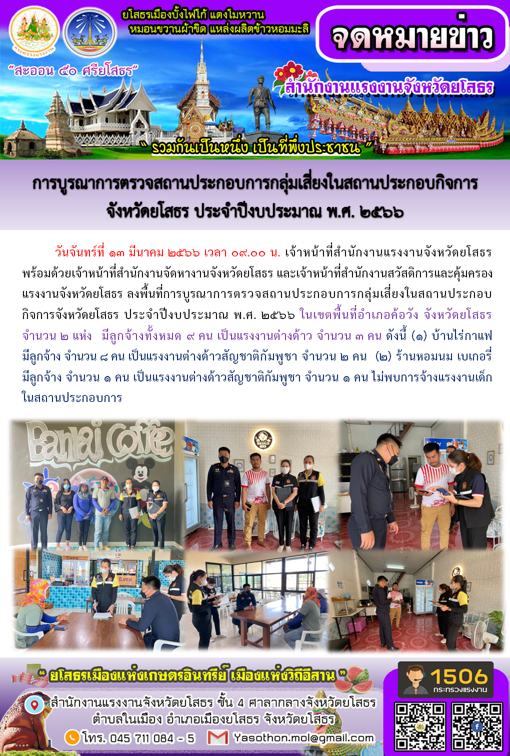 การบูรณาการตรวจสถานประกอบการกลุ่มเสี่ยงในสถานประกอบกิจการจังหวัดยโสธร ครั้งที่ 3 ประจำปีงบประมาณ พ.ศ. 2566