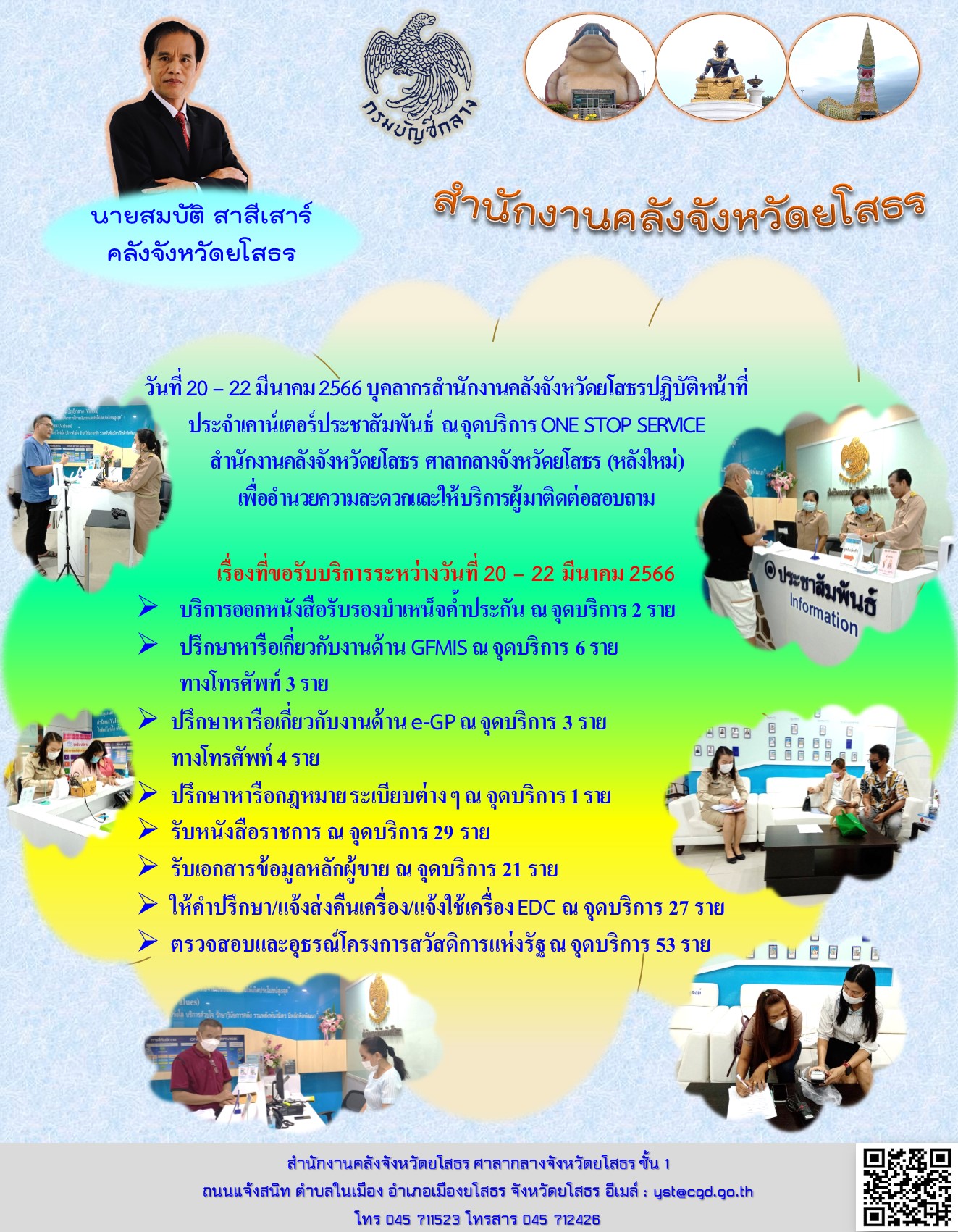 วันที่ 20 – 22 มีนาคม 2566 บุคลากรสำนักงานคลังจังหวัดยโสธรปฏิบัติหน้าที่ประจำเคาน์เตอร์ประชาสัมพันธ์ ณ จุดบริการ ONE STOP SERVICE สำนักงานคลังจังหวัดยโสธร ศาลากลางจังหวัดยโสธร (หลังใหม่) เพื่ออำนวยความสะดวกและให้บริการผู้มาติดต่อสอบถาม