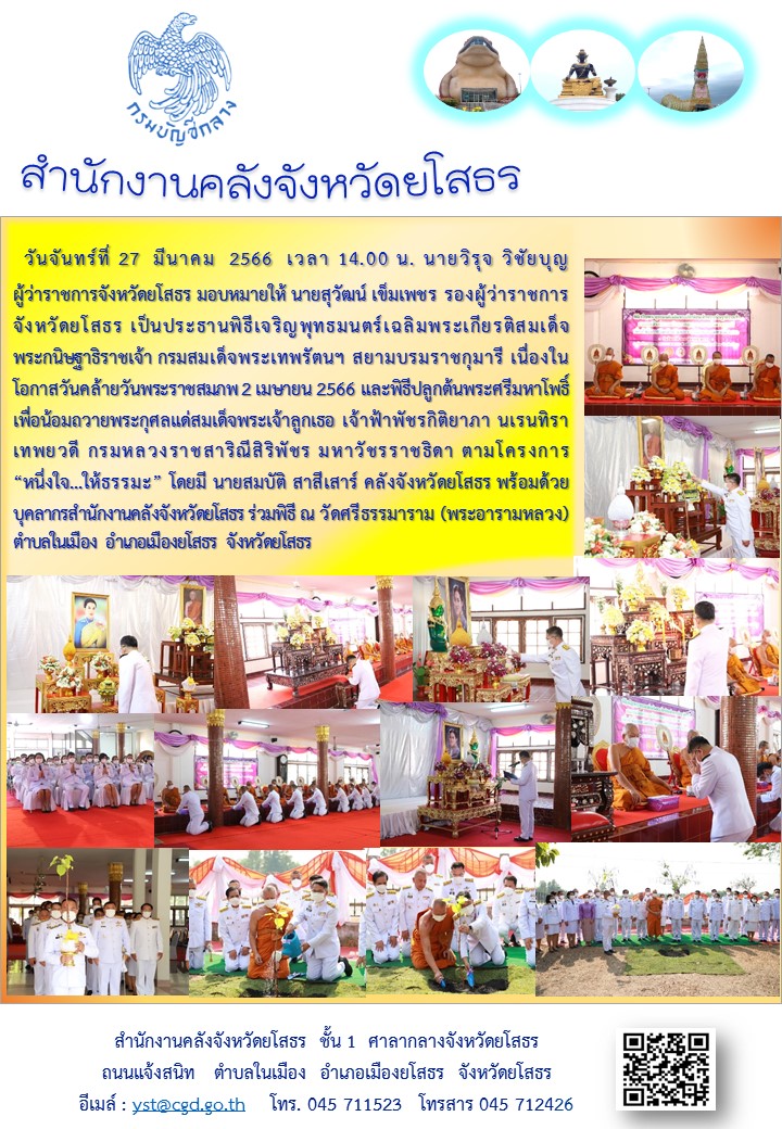 แก้ไขโดย : [สำนักงานคลังจังหวัดยโสธร] วันที่ 28 มี.ค. 2566 (13:53 น.)วันจันทร์ที่ 27 มีนาคม 2566 เวลา 14.00 น. นายวิรุจ วิชัยบุญ ผู้ว่าราชการจังหวัดยโสธร มอบหมายให้ นายสุวัฒน์ เข็มเพชร รองผู้ว่าราชการจังหวัดยโสธร เป็นประธานพิธีเจริญพุทธมนตร์เฉลิมพระเกียรติสมเด็จพระกนิษฐาธิราชเจ้า กรมสมเด็จพระเทพรัตนฯ สยามบรมราชกุมารี เนื่องในโอกาสวันคล้ายวันพระราชสมภพ 2 เมษายน 2566 และพิธีปลูกต้นพระศรีมหาโพธิ์ เพื่อน้อมถวายพระกุศลแด่สมเด็จพระเจ้าลูกเธอ เจ้าฟ้าพัชรกิติยาภา นเรนทิราเทพยวดี กรมหลวงราชสาริณีสิริพัชร มหาวัชรราชธิดา ตามโครงการ “หนึ่งใจ...ให้ธรรมะ” โดยมี นายสมบัติ สาสีเสาร์ คลังจังหวัดยโสธร พร้อมด้วยบุคลากรสำนักงานคลังจังหวัดยโสธร ร่วมพิธี ณ วัดศรีธรรมาราม (พระอารามหลวง) ตำบลในเมือง อำเภอเมืองยโสธร จังหวัดยโสธร