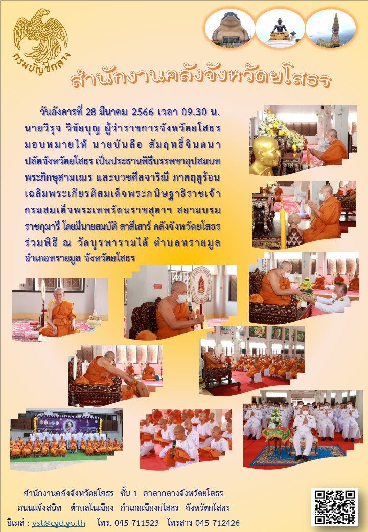 วันอังคารที่ 28 มีนาคม 2566 เวลา 09.30 น. นายวิรุจ วิชัยบุญ ผู้ว่าราชการจังหวัดยโสธร มอบหมายให้ นายบันลือ สัมฤทธิ์จินตนา ปลัดจังหวัดยโสธร เป็นประธานพิธีบรรพชาอุปสมบทพระภิกษุสามเณร และบวชศีลจาริณี ภาคฤดูร้อน เฉลิมพระเกียรติสมเด็จพระกนิษฐาธิราชเจ้า กรม