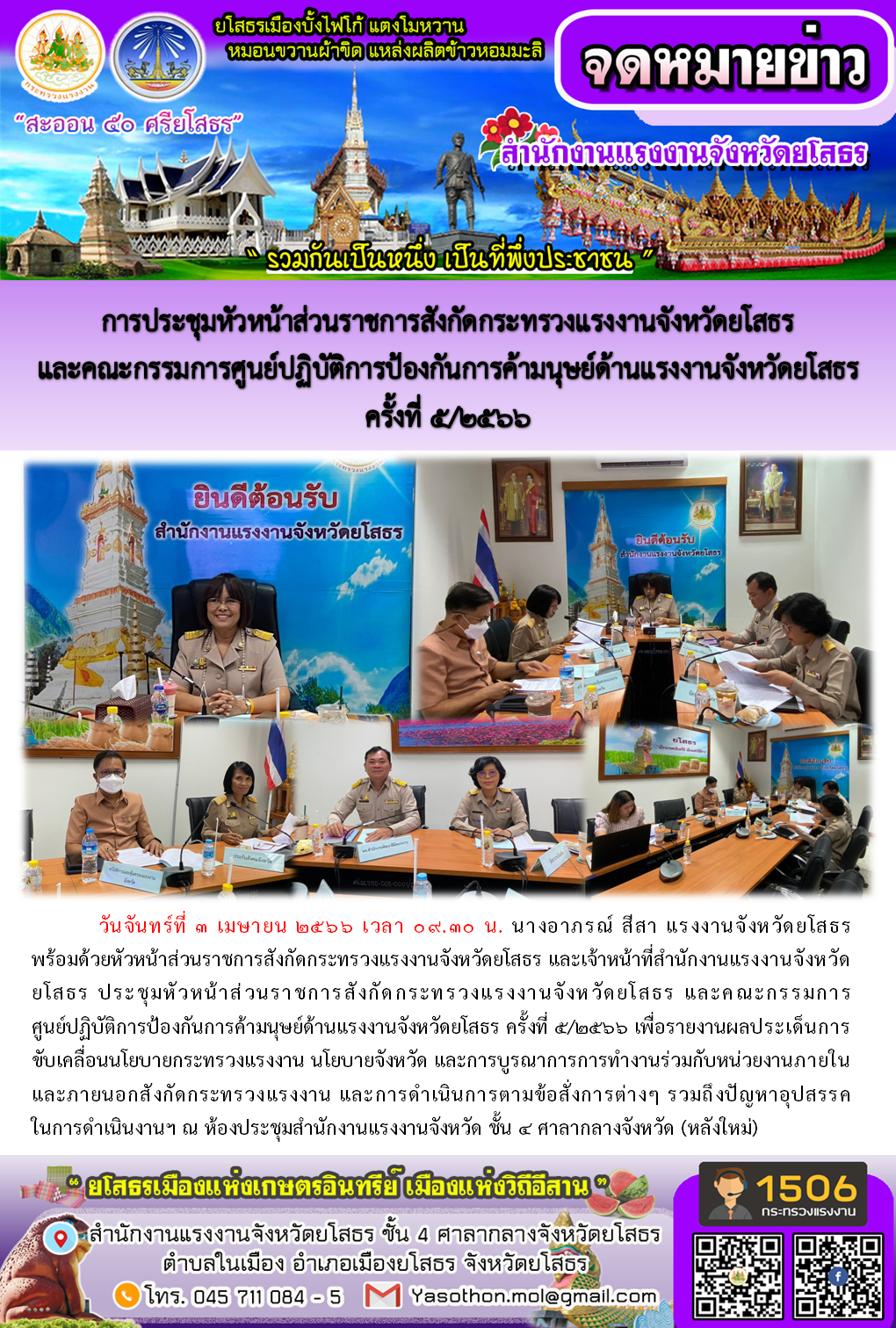 การประชุมหัวหน้าส่วนราชการสังกัดกระทรวงแรงงานจังหวัดยโสธร และคณะกรรมการศูนย์ปฏิบัติการป้องกันการค้ามนุษย์ด้านแรงงานจังหวัดยโสธร ครั้งที่ 5/2566