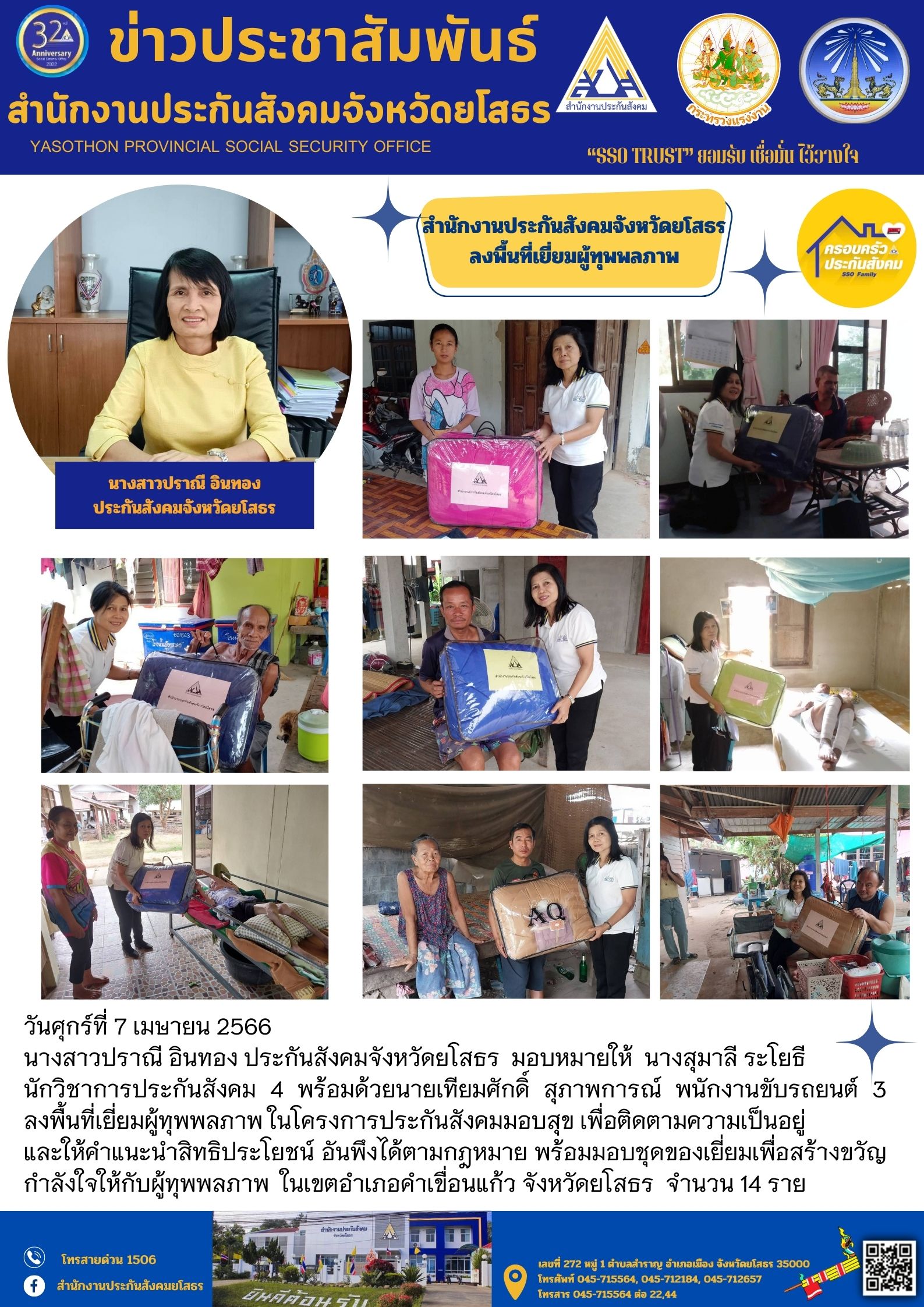 สำนักงานประกันสังคมจังหวัดยโสธร ลงพื้นที่เยี่ยมผู้ประกันตนทุพพลภาพในโครงการประกันสังคมมอบสุข เพื่อติดตามความเป็นอยู่ และให้คำแนะนำสิทธิประโยชน์ อันพึงได้ตามกฎหมาย พร้อมมอบชุดของเยี่ยมเพื่อสร้างขวัญกำลังใจให้กับผู้ทุพพลภาพ ในเขตอำเภอคำเขื่อนแก้ว จังห