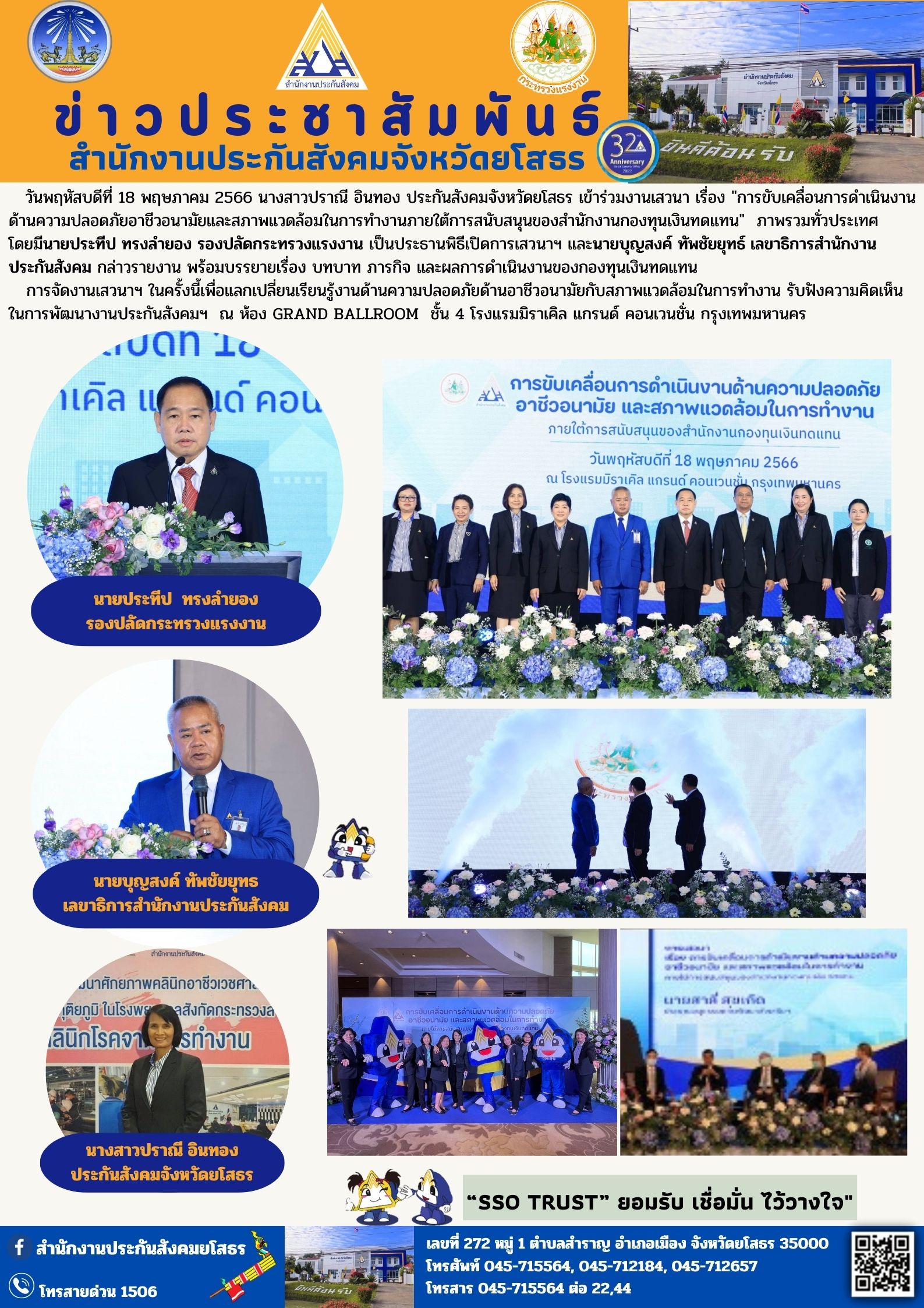 วันพฤหัสบดีที่ 18 พฤษภาคม 2566 นางสาวปราณี อินทอง ประกันสังคมจังหวัดยโสธร เข้าร่วมงานเสวนา เรื่อง "การขับเคลื่อนการดำเนินงาน ด้านความปลอดภัยอาชีวอนามัยและสภาพแวดล้อมในการทำงานภายใต้การสนับสนุนของสำนักงานกองทุนเงินทดแทน" ภาพรวมทั่วประเทศ โดยมีนายประ