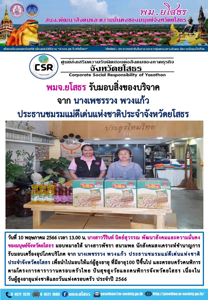 พมจ.ยโสธร รับมอบสิ่งของบริจาค จาก นางเพชรรวง พวงแก้ว ประธานมรมแม่ดีเด่นแห่งชาติประจำจังหวัดยโสธร (10 พฤษภาคม 2566)
