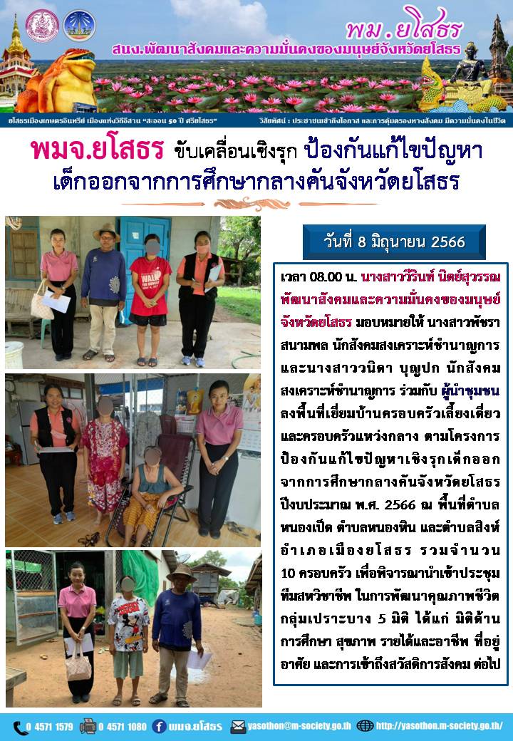 พมจ.ยโสธร ขับเคลื่อนเชิงรุก ป้องกันแก้ไขปัญหา เด็กออกจากการศึกษากลางคันจังหวัดยโสธร (8 มิถุนายน 2566)