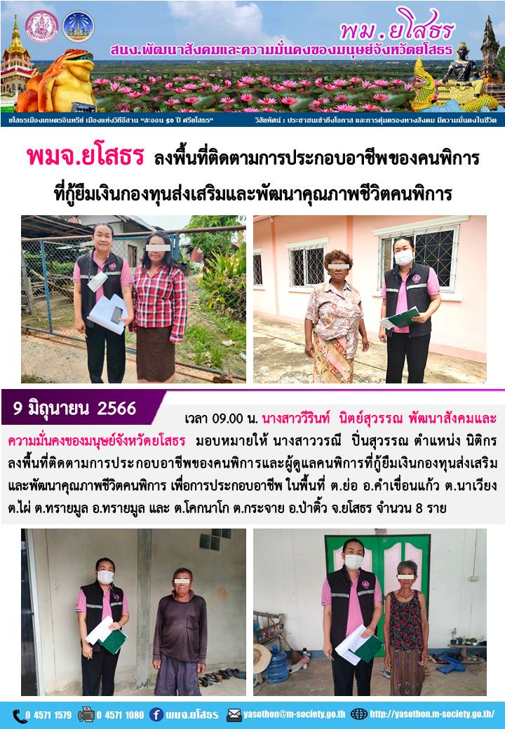 พมจ.ยโสธร ลงพื้นที่ติดตามการประกอบอาชีพของคนพิการและผู้ดูแลคนพิการที่กู้ยืมเงินกองทุนส่งเสริมและพัฒนาคุณภาพชีวิตคนพิการ (9 มิถุนายน 2566)