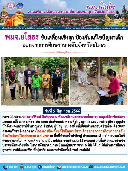 พมจ.ยโสธร ขับเคลื่อนเชิงรุก ป้องกันแก้ไขปัญหาเด็กออกจากการศึกษากลางคันจังหวัดยโสธร (9 มิถุนายน 2566)