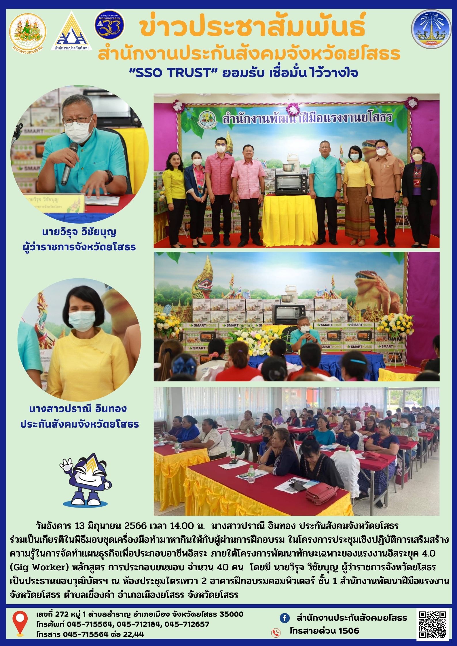 วันอังคาร 13 มิถุนายน 2566 เวลา 14.00 น. นางสาวปราณี อินทอง ประกันสังคมจังหวัดยโสธร ร่วมเป็นเกียรติในพิธีมอบชุดเครื่องมือทำมาหากินให้กับผู้ผ่านการฝึกอบรม ในโครงการประชุมเชิงปฏิบัติการเสริมสร้างความรู้ในการจัดทำแผนธุรกิจเพื่อประกอบอาชีพอิสระ ภายใต้
