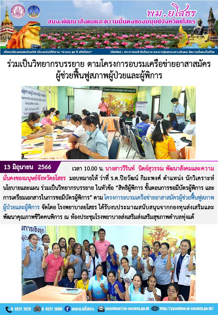 พมจ.ยโสธร ร่วมเป็นวิทยากร ตาม โครงการอบรมเครือข่ายอาสาสมัครผู้ช่วยฟื้นฟูสภาพผู้ป่วยและผู้พิการ (13 มิถุนายน 2566)
