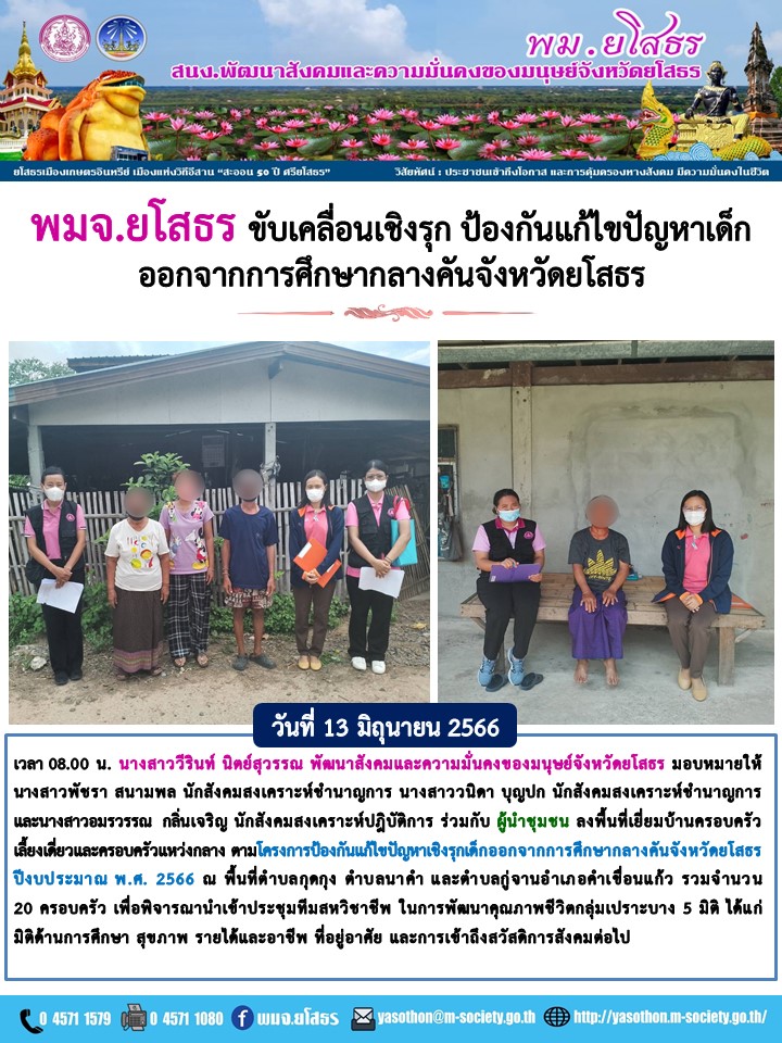 พมจ.ยโสธร ขับเคลื่อนเชิงรุก ป้องกันแก้ไขปัญหา เด็กออกจากการศึกษากลางคันจังหวัดยโสธร (13 มิถุนายน 2566)