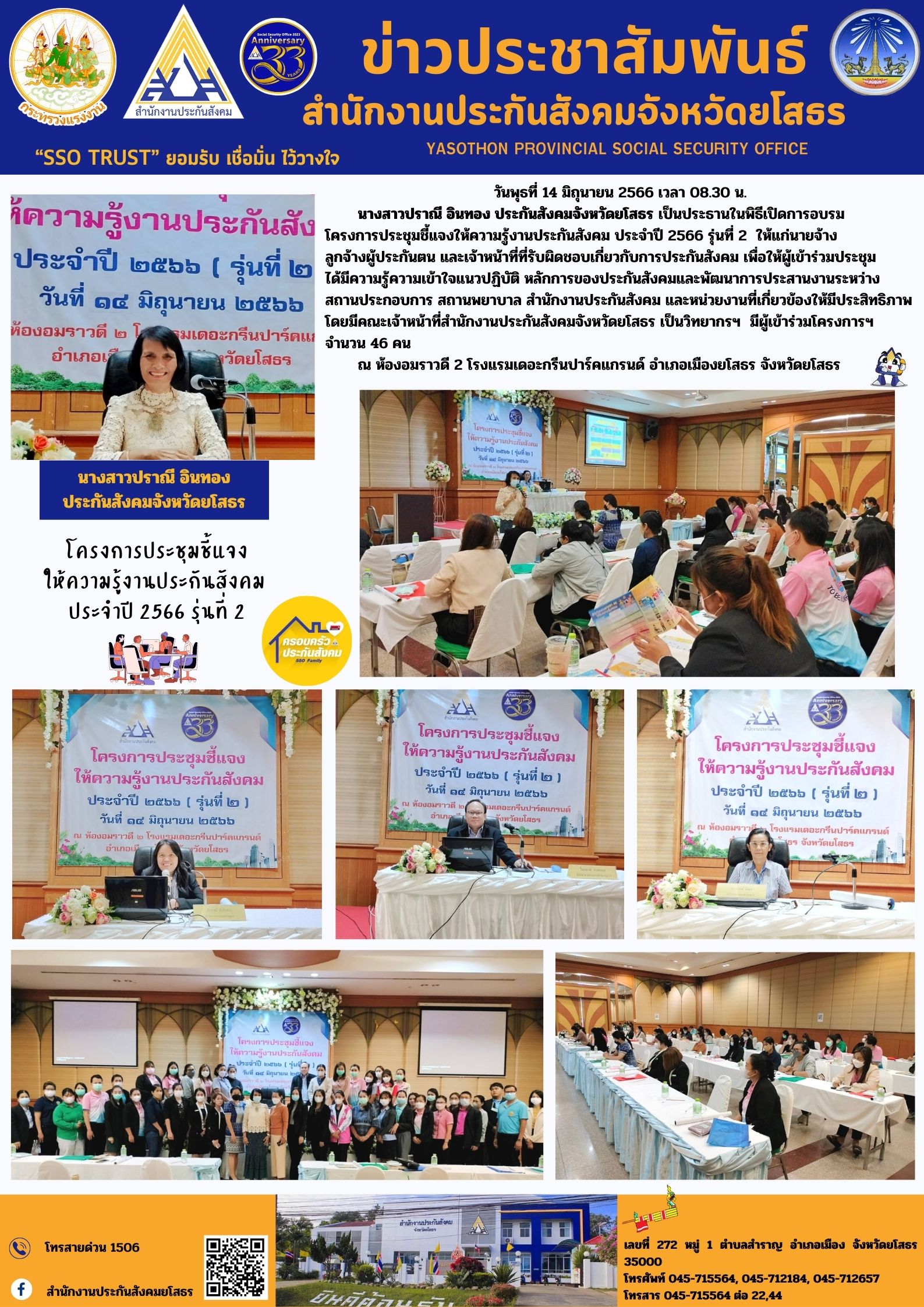 วันพุธที่ 14 มิถุนายน 2566 เวลา 08.30 น. นางสาวปราณี อินทอง ประกันสังคมจังหวัดยโสธร เป็นประธานในพิธีเปิดการอบรม โครงการประชุมชี้แจงให้ความรู้งานประกันสังคม ประจำปี 2566 รุ่นที่ 2 ให้แก่นายจ้าง ลูกจ้างผู้ประกันตน และเจ้าหน้าที่ที่รับผิดชอบ