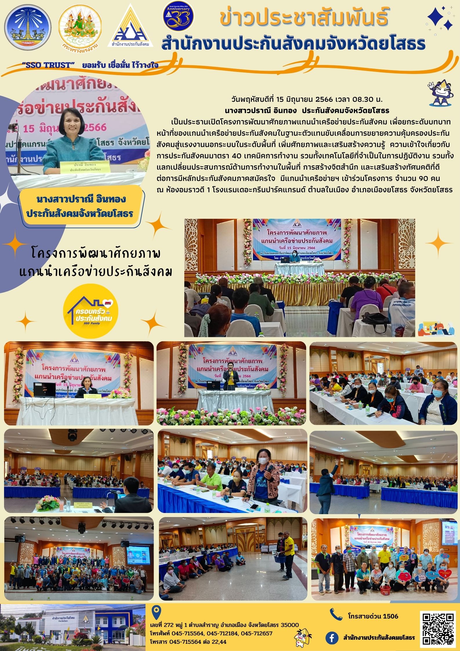 วันพฤหัสบดีที่ 15 มิถุนายน 2566 เวลา 08.30 น. นางสาวปราณี อินทอง ประกันสังคมจังหวัดยโสธร เป็นประธานเปิดโครงการพัฒนาศักยภาพแกนนำเครือข่ายประกันสังคม เพื่อยกระดับบทบาท หน้าที่ของแกนนำเครือข่ายประกันสังคมในฐานะตัวแทนขับเคลื่อนการขยายความคุ้มครองป