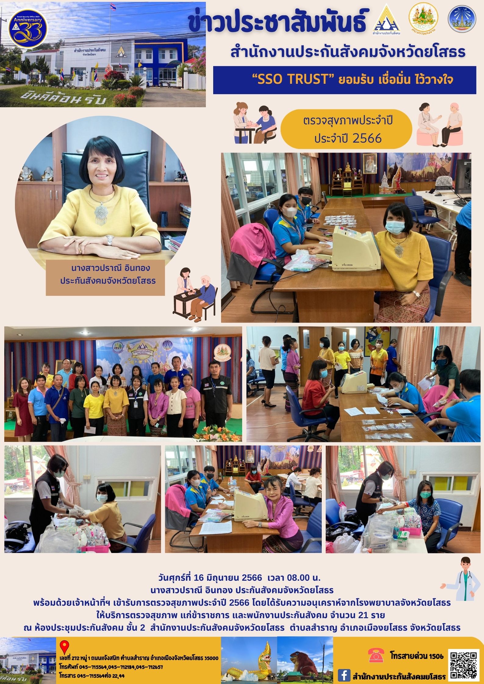 วันศุกร์ที่ 16 มิถุนายน 2566 เวลา 08.00 น. นางสาวปราณี อินทอง ประกันสังคมจังหวัดยโสธร พร้อมด้วยเจ้าหน้าที่ฯ เข้ารับการตรวจสุขภาพประจำปี 2566 โดยได้รับความอนุเคราะห์จากโรงพยาบาลจังหวัดยโสธร ให้บริการตรวจสุขภาพ แก่ข้าราชการ และพนักงานประกันสังคม จ