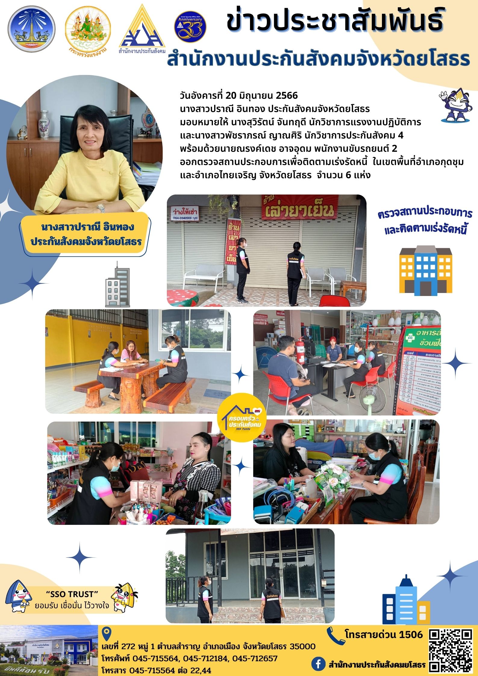 วันอังคารที่ 20 มิถุนายน 2566 นางสาวปราณี อินทอง ประกันสังคมจังหวัดยโสธร มอบหมายให้ นางสุวิรัตน์ จันทฤดี นักวิชาการแรงงานปฏิบัติการ และนางสาวพัชราภรณ์ ญาณศิริ นักวิชาการประกันสังคม 4 พร้อมด้วยนายณรงค์เดช อาจอุดม พนักงานขับรถยนต์ 2 ออกตรวจสถานประกอ