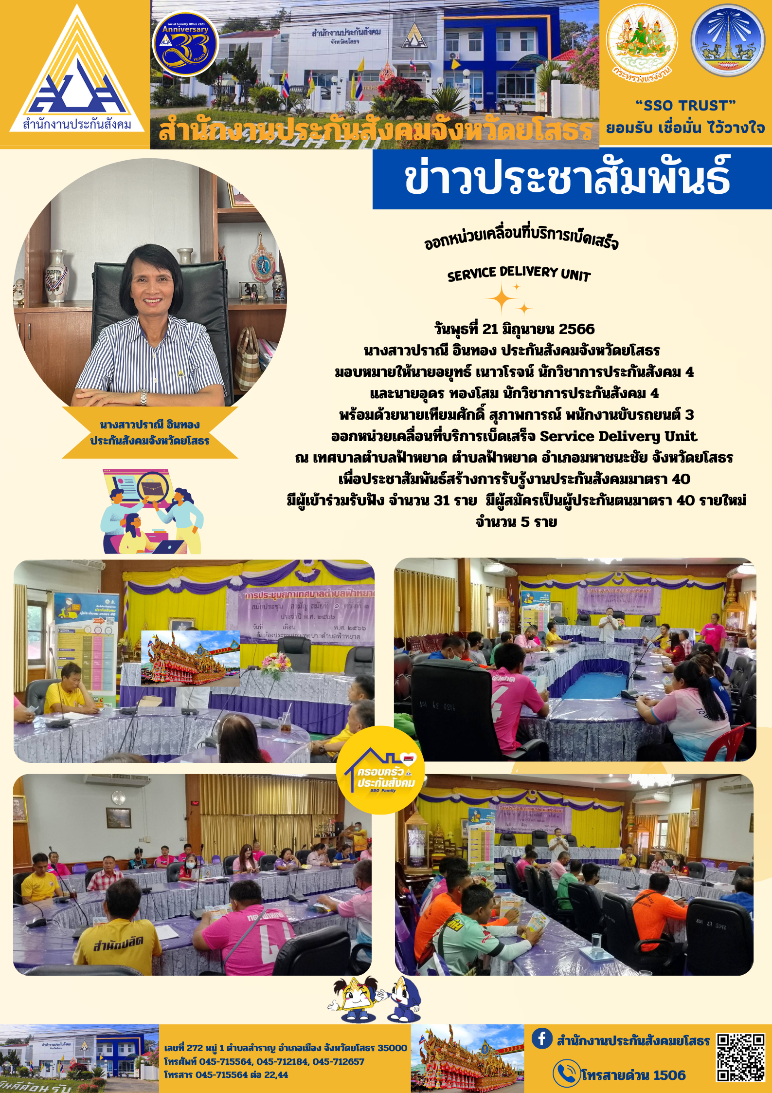 วันพุธที่ 21 มิถุนายน 2566 นางสาวปราณี อินทอง ประกันสังคมจังหวัดยโสธร มอบหมายให้นายอยุทธ์ เนาวโรจน์ นักวิชาการประกันสังคม 4 และนายอุดร ทองโสม นักวิชาการประกันสังคม 4 พร้อมด้วยนายเทียมศักดิ์ สุภาพการณ์ พนักงานขับรถยนต์ 3 ออกหน่วยเคลื่อนที่บริกา