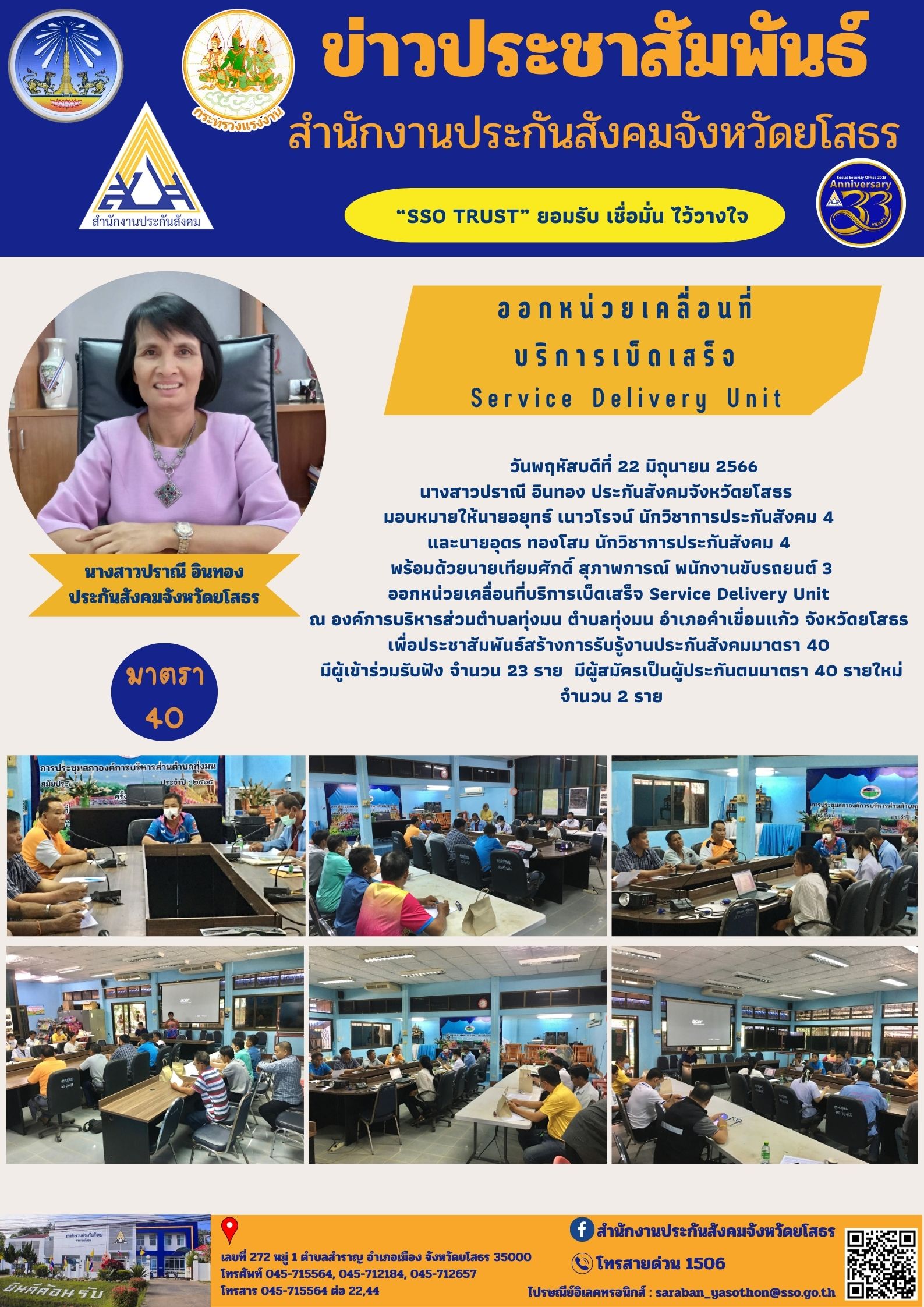 วันพฤหัสบดีที่ 22 มิถุนายน 2566 นางสาวปราณี อินทอง ประกันสังคมจังหวัดยโสธร มอบหมายให้นายอยุทธ์ เนาวโรจน์ นักวิชาการประกันสังคม 4 และนายอุดร ทองโสม นักวิชาการประกันสังคม 4 พร้อมด้วยนายเทียมศักดิ์ สุภาพการณ์ พนักงานขับรถยนต์ 3 ออกหน่วยเคลื่อนที
