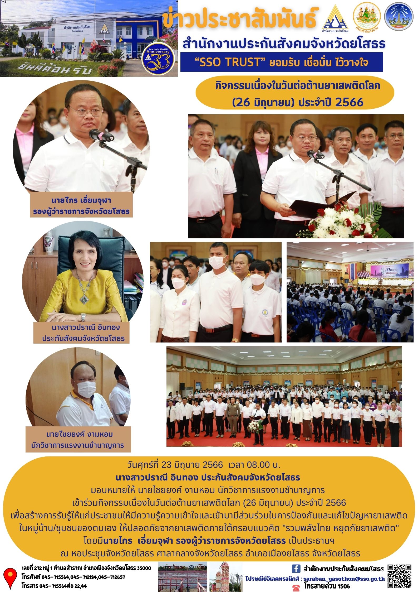 วันศุกร์ที่ 23 มิถุนาย 2566 เวลา 08.00 น. นางสาวปราณี อินทอง ประกันสังคมจังหวัดยโสธร มอบหมายให้ นายไชยยงค์ งามหอม นักวิชาการแรงงานชำนาญการ เข้าร่วมกิจกรรมเนื่องในวันต่อต้านยาเสพติดโลก (26 มิถุนายน) ประจำปี 2566 เพื่อสร้างการรับรู้ให้แก่ประชาชน