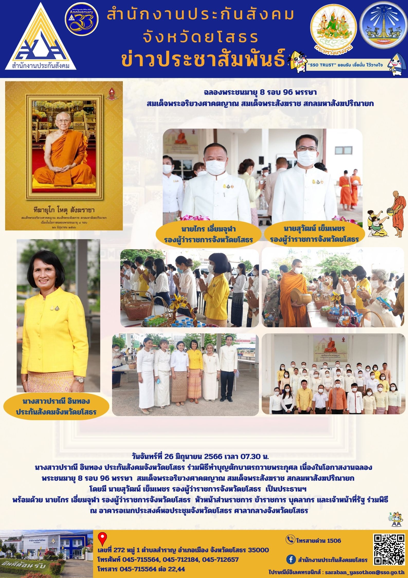วันจันทร์ที่ 26 มิถุนายน 2566 เวลา 07.30 น. นางสาวปราณี อินทอง ประกันสังคมจังหวัดยโสธร ร่วมพิธีทำบุญตักบาตรถวายพระกุศล เนื่องในโอกาสงานฉลอง พระชนมายุ 8 รอบ 96 พรรษา สมเด็จพระอริยวงศาคตญาณ สมเด็จพระสังฆราช สกลมหาสังฆปริณายก โดยมี นายสุวัฒน์ เข็ม