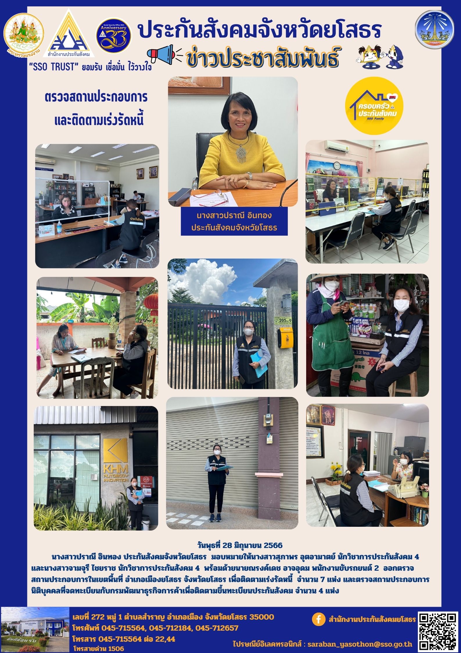 วันพุธที่ 28 มิถุนายน 2566 นางสาวปราณี อินทอง ประกันสังคมจังหวัดยโสธร มอบหมายให้นางสาวสุภาพร อุตอามาตย์ นักวิชาการประกันสังคม 4 และนางสาวจามจุรี ไชยราช นักวิชาการประกันสังคม 4 พร้อมด้วยนายณรงค์เดช อาจอุดม พนักงานขับรถยนต์ 2 ออกตรวจ สถานประกอบ
