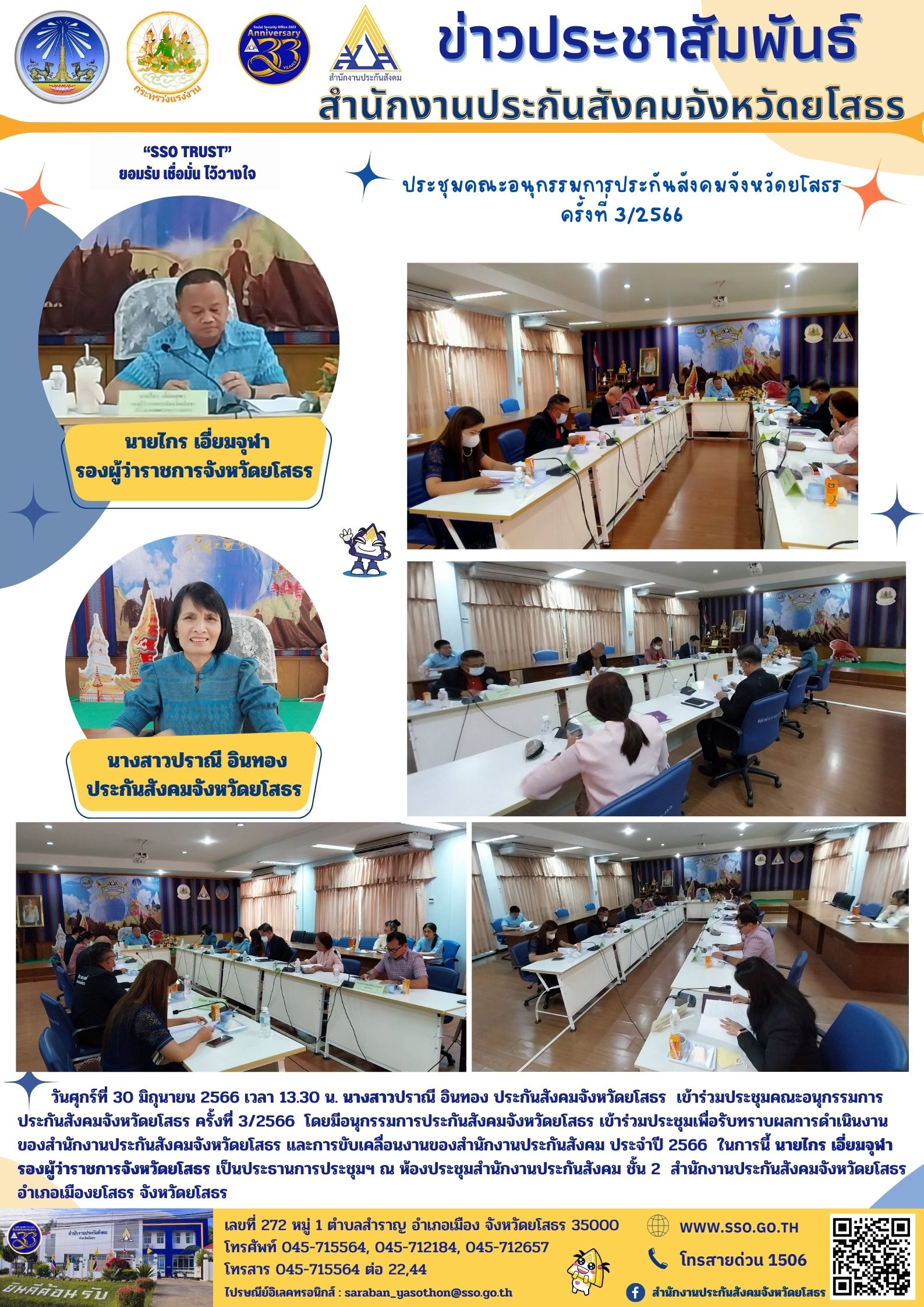 ประกันสังคมจังหวัดยโสธร ครั้งที่ 3/2566 โดยมีอนุกรรมการประกันสังคมจังหวัดยโสธร เข้าร่วมประชุมเพื่อรับทราบผลการดำเนินงานของสำนักงานประกันสังคมจังหวัดยโสธร และการขับเคลื่อนงานของสำนักงานประกันสังคม ประจำปี 2566 ในการนี้ นายไกร เอี่ยมจุฬา รองผู้ว่าราชการจังหวัดยโสธร เป็นประธานการประชุมฯ ณ ห้องประชุมสำนักงานประกันสังคม ชั้น 2 สำนักงานประกันสังคมจังหวัดยโสธร อำเภอเมืองยโสธร จังหวัดยโสธร