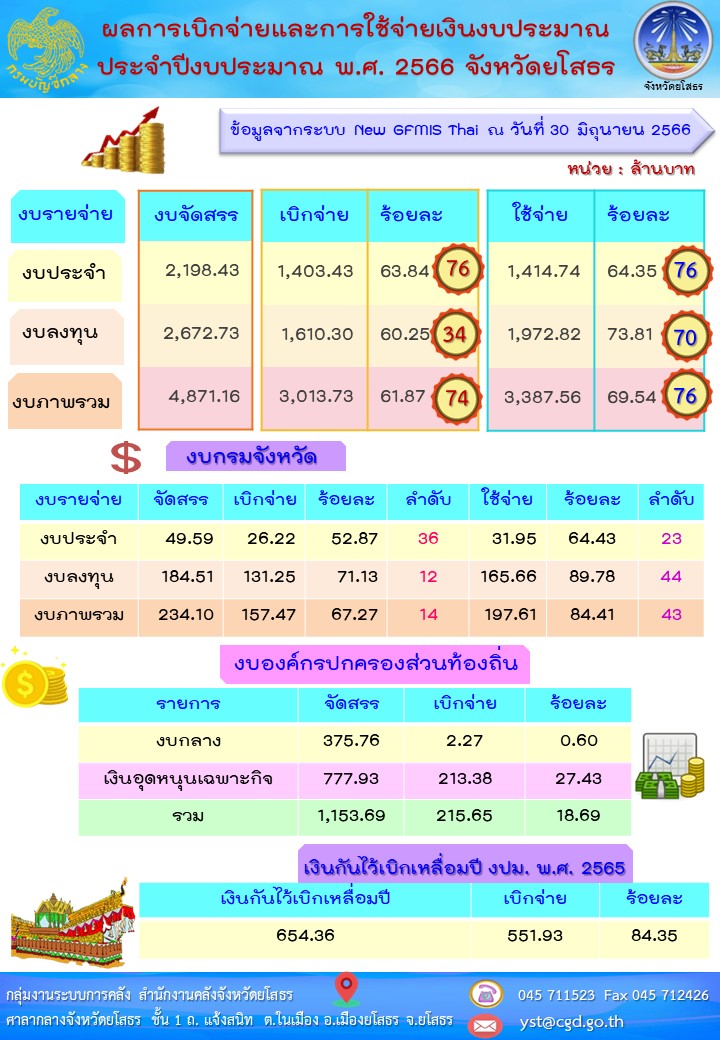 รายงานผลการเบิกจ่ายและใช้จ่ายเงินงบประมาณของจังหวัดยโสธร ข้อมูล ณ วันที่ 30 มิถุนายน 2566