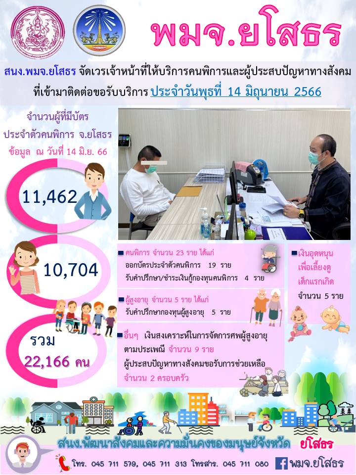สนง.พมจ.ยโสธร จัดเวรเจ้าหน้าที่ให้บริการคนพิการและผู้ประสบปัญหาทางสังคม ที่เข้ามาติดต่อขอรับบริการ (14 มิถุนายน 2566)