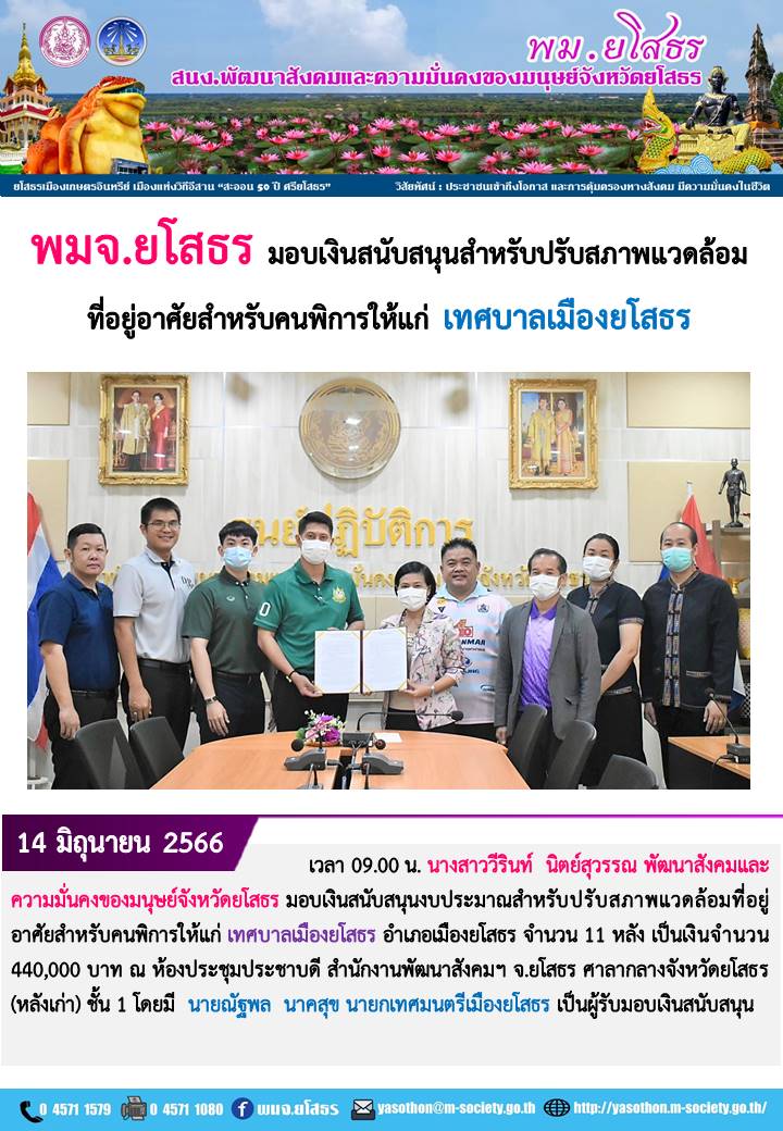 พมจ.ยโสธร มอบเงินสนับสนุนงบประมาณสำหรับปรับสภาพแวดล้อมที่อยู่อาศัยสำหรับคนพิการให้แก่ เทศบาลเมืองยโสธร (14 มิถุนายน 2566)