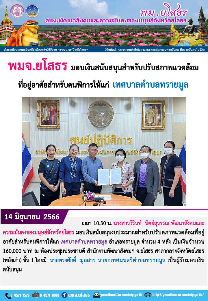 พมจ.ยโสธร มอบเงินสนับสนุนสำหรับปรับสภาพแวดล้อมที่อยู่อาศัยสำหรับคนพิการให้แก่ เทศบาลตำบลทรายมูล (14 มิถุนายน 2566)