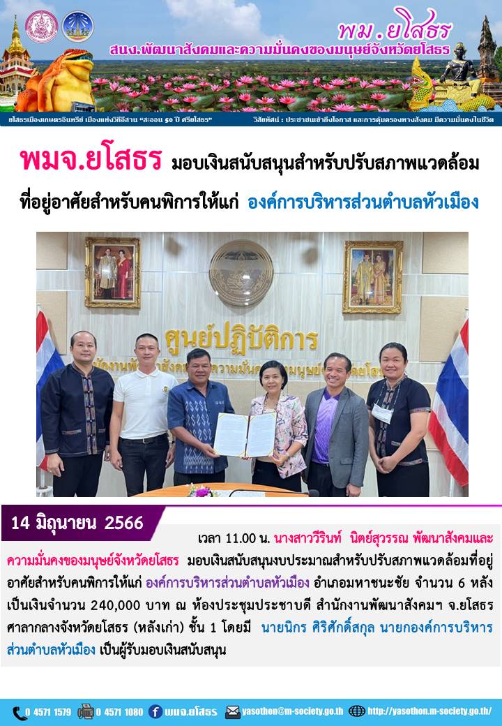 พมจ.ยโสธร มอบเงินสนับสนุนงบประมาณสำหรับปรับสภาพแวดล้อมที่อยู่อาศัยสำหรับคนพิการให้แก่ องค์การบริหารส่วนตำบลหัวเมือง (14 มิถุนายน 2566)
