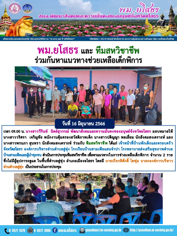 พม.ยโสธร และ ทีมสหวิชาชีพ ร่วมกันหาแนวทางช่วยเหลือเด็กพิการ (16 มิถุนายน 2566)