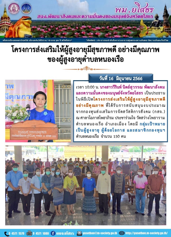 วันที่ 7 ก.ค. 2566 (22:37 น.)วันที่ 16 มิถุนายน 2566 เวลา 10:00 น. นางสาววีรินท์ นิตย์สุวรรณ พัฒนาสังคมและความมั่นคงของมนุษย์จังหวัดยโสธร เป็นประธานในพิธีเปิดโครงการส่งเสริมให้ผู้สูงอายุมีสุขภาพดี อย่างมีคุณภาพ ที่ได้รับการสนับสนุนงบประมาณจากกองทุนส่งเสริมการจัดสวัสดิการสังคม (กสจ.) ณ ศาลาโอภาสโพธาภิรม ประชาร่วมใจ วัดสว่างโพธาราม ตำบลหนองเรือ อำเภอเมือง โดยมี กลุ่มเป้าหมายเป็นผู้สูงอายุ ผู้ด้อยโอกาส และสมาชิกกองทุนฯ ตำบลหนองเรือ จำนวน 150 คน