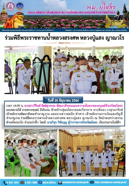 วันที่ 7 ก.ค. 2566 (23:59 น.)วันที่ 20 มิถุนายน 2566 เวลา 14:00 น. นางสาววีรินท์ นิตย์สุวรรณ พัฒนาสังคมและความมั่นคงของมนุษย์จังหวัดยโสธร มอบหมายให้ นายทรงกฤษณ์ มีพันลม หัวหน้ากลุ่มนโยบายและวิชาการ นางลินจง เวฬุวนารักษ์ เจ้าพนักงานพัฒนาสังคมชำนาญงาน และนางสาวสมนึก คำสาร เจ้าพนักงานการเงินและบัญชีชำนาญงาน ร่วมพิธีพระราชทานน้ำหลวงสรงศพ หลวงปู่แสง ญาณวโร ณ วัดป่าดงสว่างธรรม ตำบลโคกนาโก อำเภอป่าติ้ว โดยมี นายวิรุจ วิชัยบุญ ผู้ว่าราชการจังหวัดยโสธร เป็นประธานในพิธีฯ