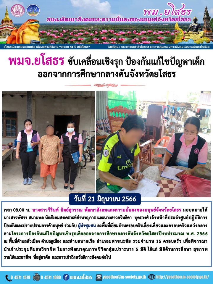 พมจ.ยโสธร ขับเคลื่อนเชิงรุก ป้องกันแก้ไขปัญหา เด็กออกจากการศึกษากลางคันจังหวัดยโสธร (21 มิถุนายน 2566)