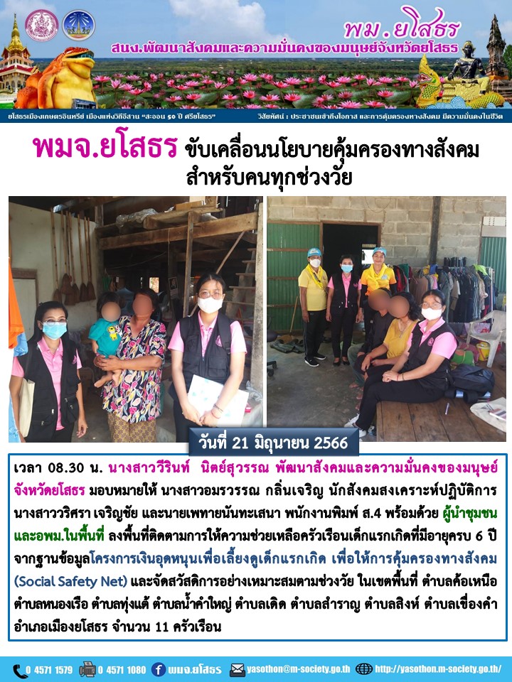 วันที่ 8 ก.ค. 2566 (00:20 น.)วันที่ 21 มิถุนายน 2566 เวลา 09.00 น. นางสาววีรินท์ นิตย์สุวรรณ พัฒนาสังคมและความมั่นคงของมนุษย์จังหวัดยโสธร มอบหมายให้ นางสาวอมรวรรณ กลิ่นเจริญ นักสังคมสงเคราะห์ปฏิบัติการ นางสาววริศรา เจริญชัย และนายเพทายนันทะเสนา พนักงานพิมพ์ ส.4 พร้อมด้วย ผู้นำชุมชน และอพม.ในพื้นที่ ลงพื้นที่ติดตามการให้ความช่วยเหลือครัวเรือนเด็กแรกเกิดที่มีอายุครบ 6 ปี จากฐานข้อมูลโครงการเงินอุดหนุนเพื่อเลี้ยงดูเด็กแรกเกิด เพื่อให้การคุ้มครองทางสังคม (Social Safety Net) และจัดสวัสดิการอย่างเหมาะสมตามช่วงวัยในเขตพื้นที่ ต.ค้อเหนือ ต.หนองเรือ ต.ทุ่งแต้ ต.น้ำคำใหญ่ ต.เดิด ต.สำราญ ต.สิงห์ ต.เขื่องคำ อ.เมืองยโสธร จำนวน 11 ครัวเรือน
