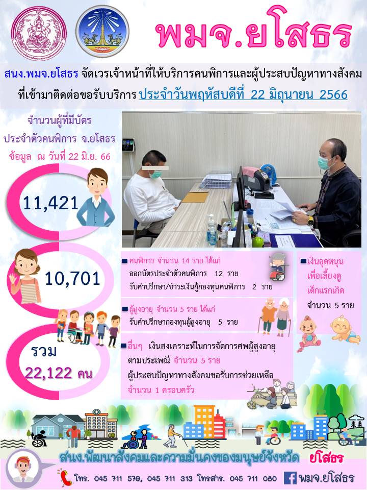 สนง.พมจ.ยโสธร จัดเวรเจ้าหน้าที่ให้บริการคนพิการและผู้ประสบปัญหาทางสังคม ที่เข้ามาติดต่อขอรับบริการ (22 มิถุนายน 2566)