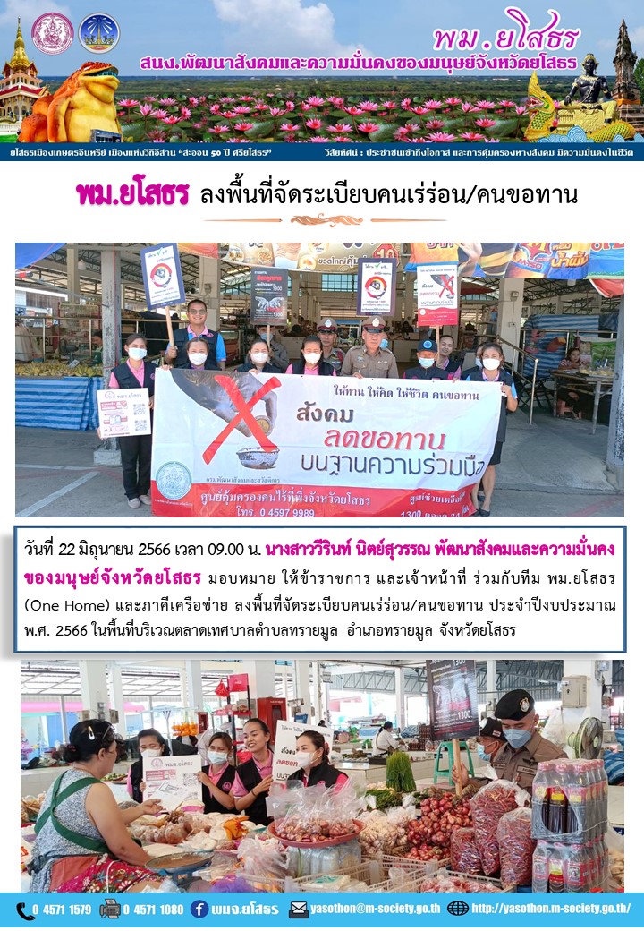 วันที่ 8 ก.ค. 2566 (00:43 น.)วันที่ 22 มิถุนายน 2566 เวลา 09.00 น. นางสาววีรินท์ นิตย์สุวรรณ พัฒนาสังคมและความมั่นคงของมนุษย์จังหวัดยโสธร มอบหมาย ให้ข้าราชการ และเจ้าหน้าที่ ร่วมกับทีม พม.ยโสธร (One Home) และภาคีเครือข่าย ลงพื้นที่จัดระเบียบคนเร่ร่อน/คนขอทาน ประจำปีงบประมาณ พ.ศ. 2566 ในพื้นที่บริเวณตลาดเทศบาลตำบลทรายมูล อำเภอทรายมูล จังหวัดยโสธร