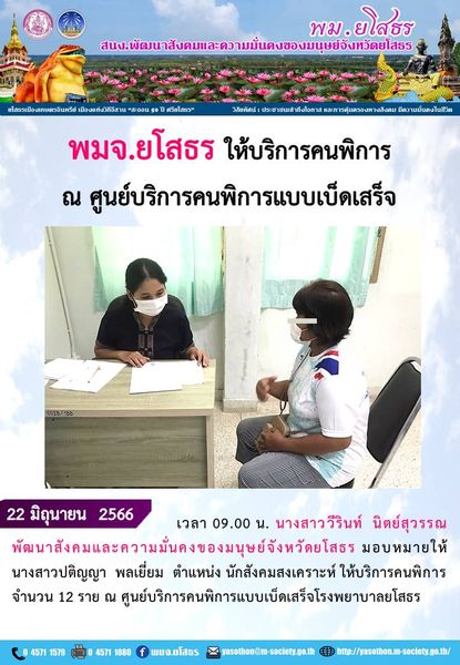 วันที่ 8 ก.ค. 2566 (00:58 น.)วันที่ 22 มิถุนายน 2566 เวลา 09.00 น. นางสาววีรินท์ นิตย์สุวรรณ พัฒนาสังคมและความมั่นคงของมนุษย์จังหวัดยโสธร มอบหมายให้ นางสาวปติญญา พลเยี่ยม ตำแหน่ง นักสังคมสงเคราะห์ ให้บริการคนพิการ จำนวน 12 ราย ณ ศูนย์บริการคนพิการแบบเบ็ดเสร็จโรงพยาบาลยโสธร