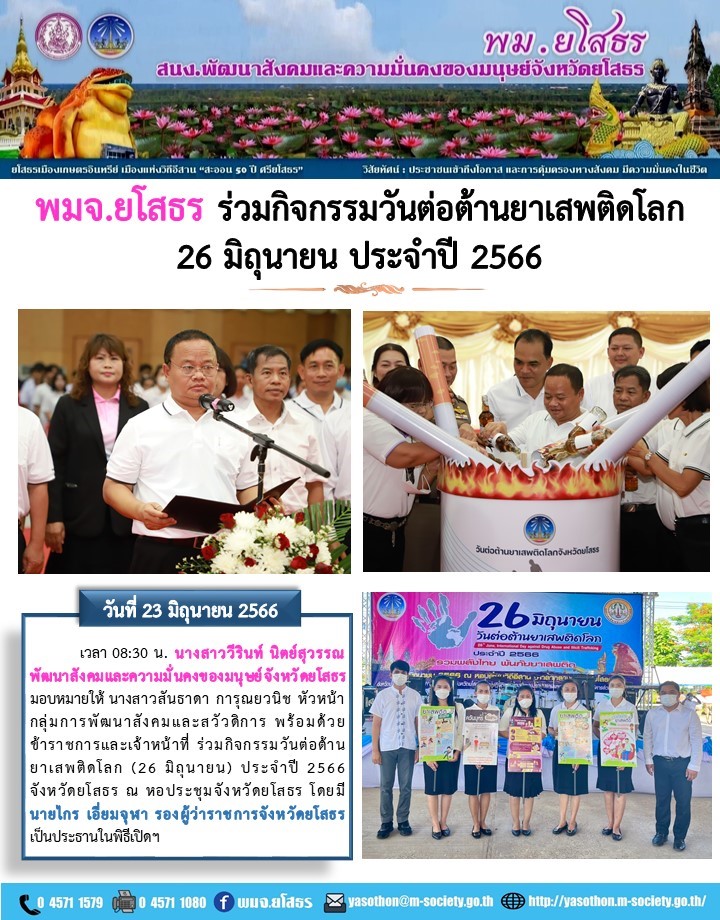 พมจ.ยโสธร ร่วมกิจกรรมวันต่อต้านยาเสพติดโลก (26 มิถุนายน) ประจำปี 2566 (23 มิถุนายน 2566)