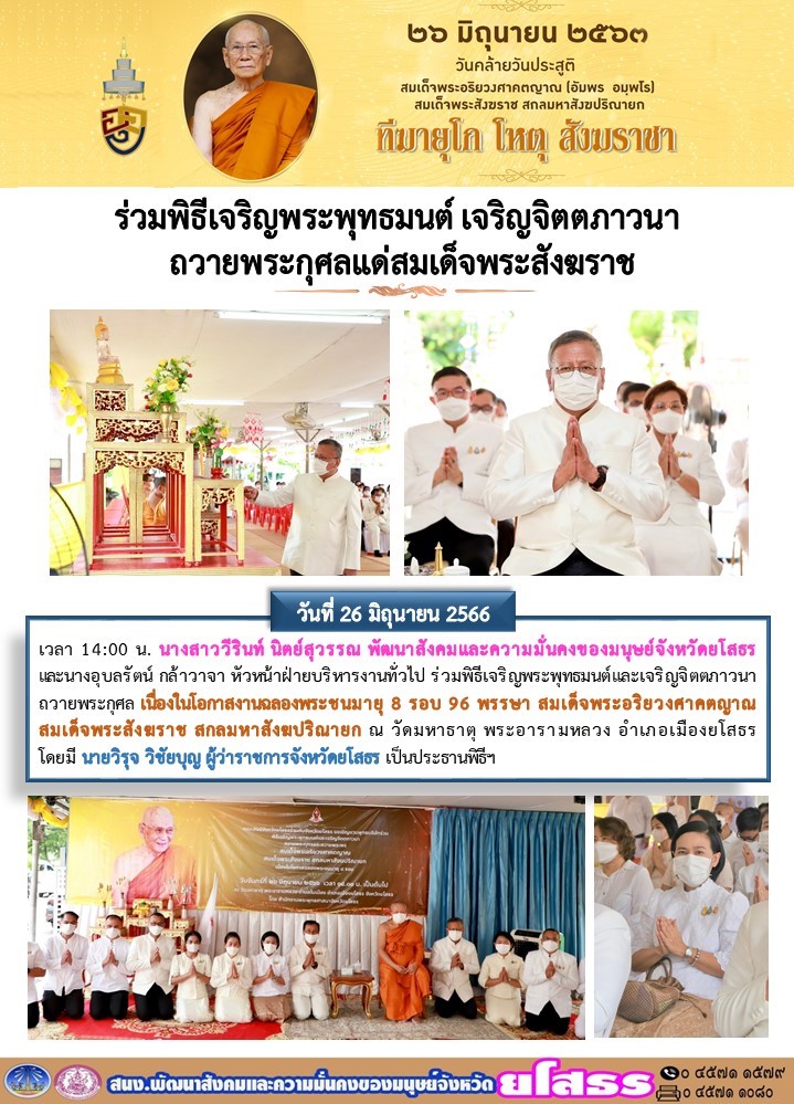 วันที่ 8 ก.ค. 2566 (01:34 น.)วันที่ 26 มิถุนายน 2566 เวลา 14:00 น. นางสาววีรินท์ นิตย์สุวรรณ พัฒนาสังคมและความมั่นคงของมนุษย์จังหวัดยโสธร และนางอุบลรัตน์ กล้าวาจา หัวหน้าฝ่ายบริหารงานทั่วไป ร่วมพิธีเจริญพระพุทธมนต์และเจริญจิตตภาวนาถวายพระกุศล เนื่องในโอกาสงานฉลองพระชนมายุ 8 รอบ 96 พรรษา สมเด็จพระอริยวงศาคตญาณ สมเด็จพระสังฆราช สกลมหาสังฆปริณายก ณ วัดมหาธาตุ พระอารามหลวง อำเภอเมืองยโสธร โดยมี นายวิรุจ วิชัยบุญ ผู้ว่าราชการจังหวัดยโสธร เป็นประธานพิธีฯ