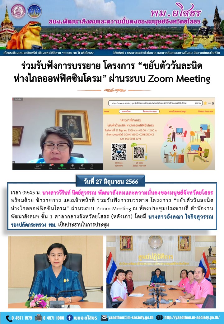 วันที่ 8 ก.ค. 2566 (01:42 น.)วันที่ 27 มิถุนายน 2566 เวลา 09:45 น. นางสาววีรินท์ นิตย์สุวรรณ พัฒนาสังคมและความมั่นคงของมนุษย์จังหวัดยโสธร พร้อมด้วย ข้าราชการ และเจ้าหน้าที่ ร่วมรับฟังการบรรยาย โครงการ “ขยับตัววันละนิด ห่างไกลออฟฟิศซินโดรม” ผ่านระบบ Zoom Meeting ณ ห้องประชุมประชาบดี สำนักงานพัฒนาสังคมฯ ชั้น 1 ศาลากลางจังหวัดยโสธร (หลังเก่า) โดยมี นางสาวอังคณา ใจกิจสุวรรณ รองปลัดกระทรวง พม. เป็นประธานในการประชุม