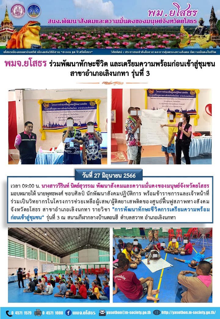 พมจ.ยโสธร ร่วมพัฒนาทักษะชีวิต และเตรียมความพร้อมก่อนเข้าสู่ชุมชน สาขาอำเภอเลิงนกทา รุ่นที่ 3 (27 มิถุนายน 2566)