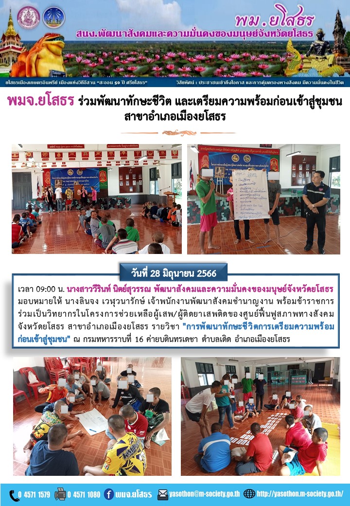 พมจ.ยโสธร ร่วมพัฒนาทักษะชีวิต และเตรียมความพร้อมก่อนเข้าสู่ชุมชน อำเภอเมืองยโสธร (28 มิถุนายน 2566)